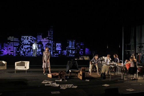 L’illusion théâtrale n’est pas de mise, ce qui répond bien aux contraintes de l’adaptation. Qu’il s’exprime en son nom ou que le comédien parle de son personnage à la troisième personne en suivant le texte à la lettre, il se tourne vers le public et s’adresse à lui. Ceux qui ne sont pas impliqués dans les différentes scènes – lorsqu’ils ne dessinent pas un arrière-plan derrière le voile translucide qui sépare la scène en deux – restent sur le plateau et deviennent nos doubles : ils regardent leurs pairs et réagissent à leurs propos comme s’ils découvraient le texte.