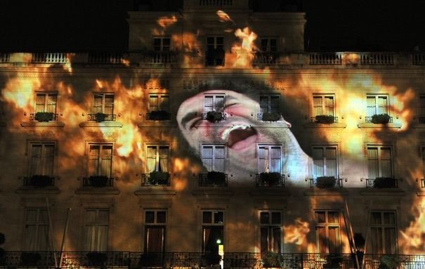 Le Palace, offrant sa façade royale à la projection de mots taillés à la serpe (« à la faucille » serait plus approprié) qui invitent à l’insoumission … Rien de plus incongru, incarnation de la révolte révolutionnaire qui va embraser le monde comme le jeu de lumières dévorant de ses flammes la façade de l’auguste monument nous le donne à voir. Les grands bourgeois massés au balcon et buvant au rythme de la musique leur verre de bordeaux rouge auraient de quoi trembler si leur suffisance ne les rendait inconscients du « vent qui se lève » et qui les anéantira.