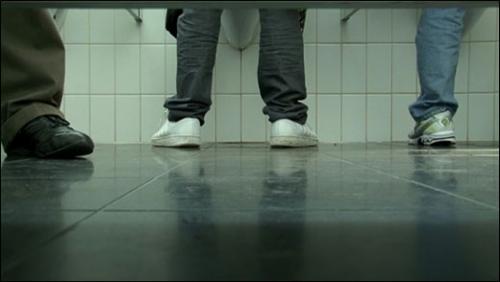 De part et d’autre des huit moniteurs, sont projetés deux films liés à la ville de New York. NYX, Fall (2009) est composé de plans multiples de la ville, des ponts, des trottoirs, d’objets et de travailleurs. Le titre de l’exposition vient d’ailleurs des panneaux de signalisation qu’il a rencontrés lors de ses promenades dans la ville. Il juxtapose ces injonctions publiques aux parcours des escorts. Thierry Micouin a choisi d’entrecouper ces vues urbaines au quotidien des escorts : corps, accessoires, visages en surimpressions, masqués. On y décèle une furtive chorégraphie dans les rues de New York avec David, l’un des escorts interviewé. Le second film, Golden Shoes, est un plan fixe sur les pieds d’hommes dans des toilettes publiques à New York. Face à l’écran, nous nous retrouvons dans une position de voyeur frustrés. Si nous ne voyons rien à partir des pieds masculins, la bande sonore nous indique leurs déambulations mécaniques des toilettes, vers les robinets et le sèche-main. Le voyeurisme est suggéré, il fait appel à un imaginaire collectif et à nos expériences.