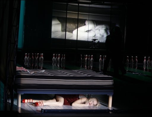 La scénographie n’en reste pas là. Musique, chant, projections de texte, costumes multiples et éléments éphémères habitent ce paysage mental difficile d’accès. Les quilles de bowling qui servent de toile de fond et les meubles qui occupent l’avant-scène ne servent pas non plus de points d’attache. Seul les chapitres annoncés par la vidéo posent des jalons dans ce parcours et atténuent le flou du spectacle qui s’est ajouté à celui du passé de Blanche.
