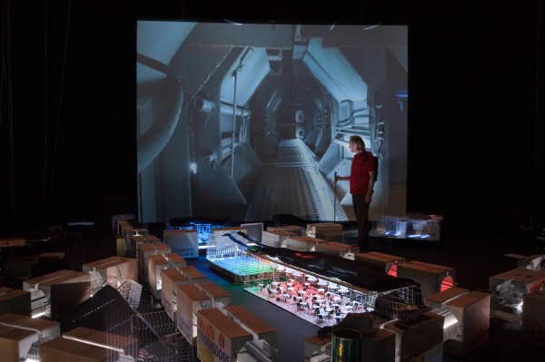 Sur l’écran, tous les couloirs et les salles vides, sans aucun signe de vie. Seule la voix du capitaine nous rattache àune forme d’humanité. Elle raconte le quotidien du bateau, la nostalgie de ses habitants, l’amenuisement des ressources. Le spectacle devient tout à fait sombre, son humour noir de plus en plus terrible : la caméra se met à grésiller au moment de filmer une porte avec des signes de danger« radioactivité », le capitaine rapporte une discussion entre Frankenstein et le Docteur Mengele…