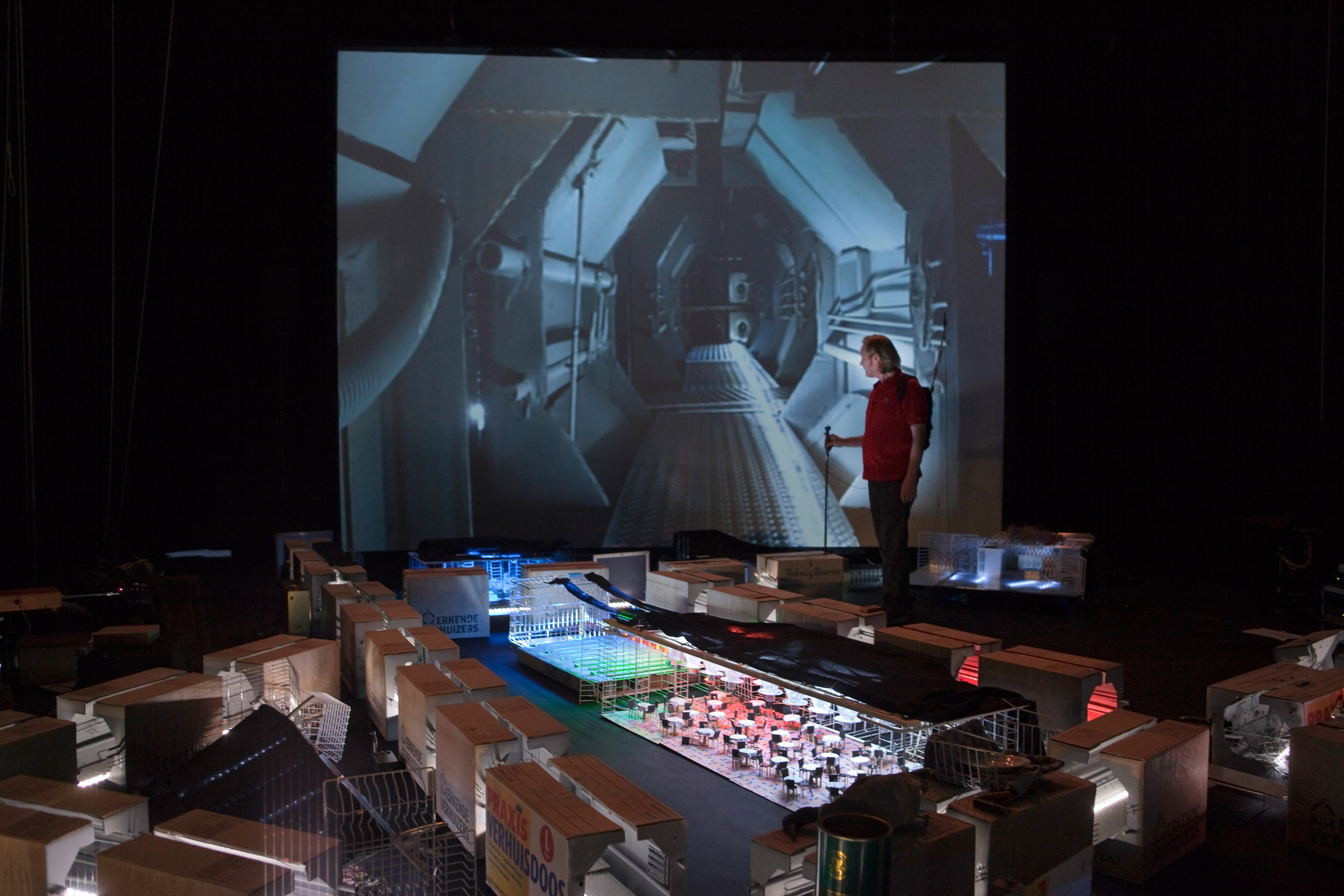 Traduit littéralement, le titre de la représentation signifie « hydravion ravitailleur ». (avec, peut-être ?, un petit jeu de mot sur moederschap (maternite) et schip(bateau)). Pour figurer le vaisseau, « Hotel Modern » utilise une très belle mise en scène : un acteur entre, portant une longue tige au bout de laquelle il tient une caméra, qu’il passe dans les boîtes de déménagement, par la fente. Un grand écran retransmet ce qui est filmé. C’est un moment magique et déstabilisant. Si l’on regarde l’écran, on pense voir Star Wars, un vaisseau, des câbles, des couloirs, du métal partout. Si l’on regarde la scène, on voit des cartons de déménagements organisés en petit train. C’est fascinant. Le spectateur passe de la réalité de la scène à la réalité de l’écran, pense à la falsification des images, aux dimensions du regard, au prisme de l’interprétation.