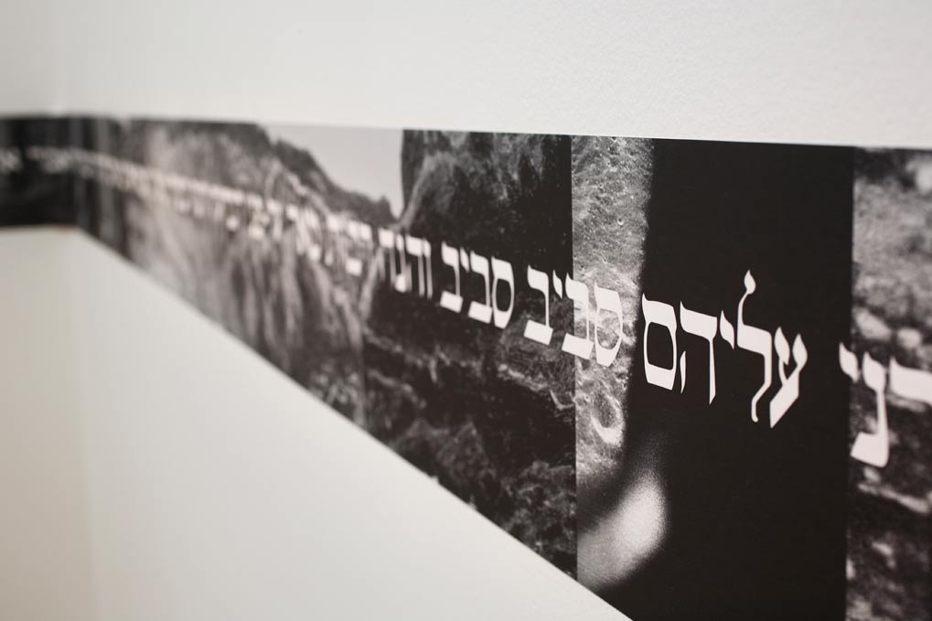 L’étude du texte d’Ezéchiel a donné naissance à une série de dessins en noir et blanc sur calque (Ecclésiaste 7-), une œuvre murale formée d’un rouleau de papier intitulé Megillah Ben Adam et Saviv saviv, un ensemble de tablettes lumineuses faisant état de paysages lumineux où la « vie pulsée et injectée dans des rhizomes d’arbres caducs, système veineux d’où surgit cette vie tout autour ». (Carole Benzaken). Dès lors nous constatons la disparition temporaire de la peinture et des couleurs vives au profit d’une œuvre dessinée sobre, spirituelle et lumineuse. Megillah Ben Adam (Megillah signifie rouleau en hébreu) se déploie au centre des murs blancs de la première pièce de l’exposition. Un rouleau de papier sur lequel Carole Benzaken a reproduit entièrement le texte de la prophétie d’Ezéchiel, dont les lettres hébraïques blanches sont juxtaposées aux images dessinées. Nous y voyons des paysages boisés (en référence à la traduction de Birkenau), des jambes d’enfants sautillant, des champs, des images en mouvement comme prises d’un train, un avion, un visage fragmenté etc. Des paysages qui font échos aux dessins sur calque présentant des paysages boisés, quasi abstraits. Sans volonté d’illustrer directement la prophétie, l’artiste a regroupé des images et des impressions intimement liées à la Shoah, à son exil (images fuyantes) et à son voyage voué à une réconciliation non seulement avec elle-même mais aussi avec une Histoire pesante.