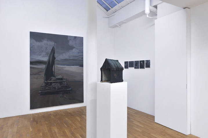 Les titres d’œuvres nous indiquent l’existence d’un passeur, de solitaires, d’une traversée. Alors, le groupe de migrants nous amène à penser aux traversées quotidiennes entre le continent africain et le continent européen. Des traversées aux espoirs déçus, où des hommes, des familles, risquent leurs vies pour atteindre les rives d’un ailleurs faussement prometteur, une île fantasmée. Au centre de l’espace de la galerie est présentée une tente, un abri, fait de lamelles de bois recouvertes de fragments de toiles peints. Le tissu est imbibé de couleurs, des teintes sombres, identiques à celles des peintures environnantes. Cet abri de fortune fait écho non seulement à une série de peinture dédiée aux tentes, mais aussi à la suite du voyage des migrants ou des naufragés. Une fois arrivés sur l’île, il leur faut bâtir un abri pour simplement se protéger et trouver un sentiment de rassurance. Ces foyers instables sont bricolés et fabriqués à partir de matériaux récoltés çà et là : du bois, du plastique, du tissu, du carton, de la taule. Ils constituent une étape, une transition, entre deux territoires, deux périodes, avant et après. L’abri précaire et temporaire, est la maigre matérialisation d’un entre-deux, une étape flottante et perturbante avant un nouveau départ.