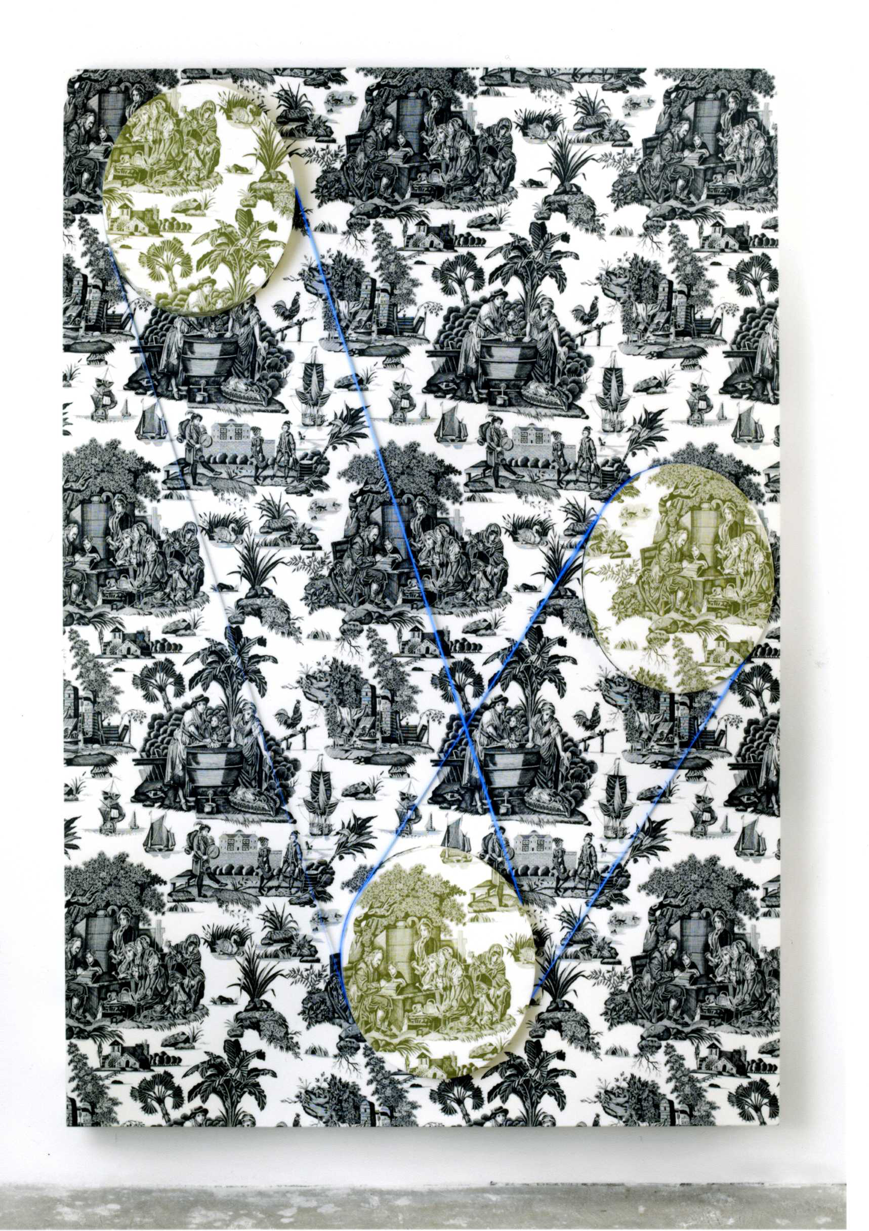 La culture populaire fait partie intégrante de sa pratique. Il utilise des objets sériels, communs. Des objets qui titillent nos souvenirs, proches et lointains, qui ravivent un imaginaire collectif et intime. Ainsi nous découvrons, disséminées dans l’espace de la galerie, des assiettes de Delphes, collectionnées par l’artiste. À la manière d’un all over, il s’approprie les murs et installe sa vision plastique et théorique. Les assiettes, ready-made provenant d’héritages familiaux, côtoient les peintures abstraites de Pinaud. Il brouille ainsi les frontières entre art et artisanat, high et low, populaire et élitiste. En ce sens, les tissus jouent un rôle important dans son œuvre. Il produit de subtils patchworks formés de tissus trouvés, chinés, offerts. Des fragments authentiques, cousus par d’autres personnes, ou bien sériels, produits industriellement, qu’il rassemble dans une même œuvre. Chaque étoffe contient une histoire, une époque, une pensée. Les assiettes et les tissus dialoguent via des représentations de scènes naïves, bucoliques, paysannes, bourgeoises ou naturalistes. Les motifs textiles et céramiques interagissent et se répondent.