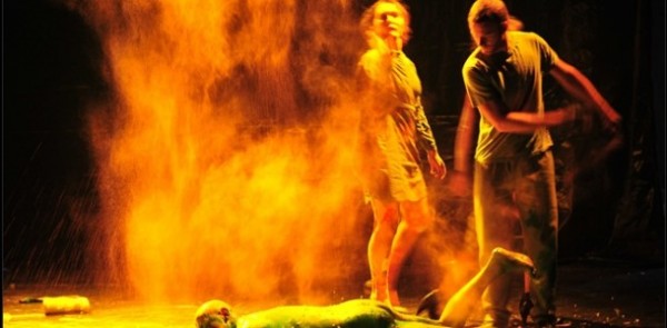 La performance réside toute entière dans l’esthétique. La prouesse est autant visuelle que sonore – comme l’indique la mention « paysage sonore : Antoine Herniotte » dans le programme. Les comédiens pratiquent avec autant de souplesse le chant que les bruitages, et l’ouverture du spectacle sur le festin de Job est un délice pour les sens. Le serveur aux lunettes, dépassé, se sert une aspirine dans une flûte de champagne avant de repartir maladroitement en faisant tomber les bouteilles en plastique qui encombrent le sol.