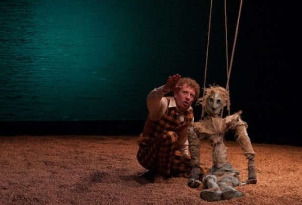 Et ce texte passe certainement mieux par l’écoute, par l’attention portée au dire que par la lecture. Il peut même devenir appétissant dans la bouche de ce grand gaillard dont la couleur capillaire réchauffe d’emblée le décor funeste ambiant. Les choix de mise en scène viennent ponctuer le texte sans l’encombrer, l’interprétant dans les grandes lignes, lui laissant ainsi l’absolue exclusivité de l’altération. Le décor est légèrement traité mais la performance flamboyante de Sharif Andoura ne requiert aucun artifice, sinon de couleur orange ! Un hexagone de gravier, mappemonde de cet état qu’il traverse depuis la rivière de Dublin, une pelle en avant, une rivière en plan fixe à l’arrière, image mouvante inter-changeante avec un ciel ombragée ou une ombre cauchemardesque et enfin, pendouillant dans le vide, il y a Finnemort : la marionnette, le cadavre de Finnegans, en nom et place du Père.