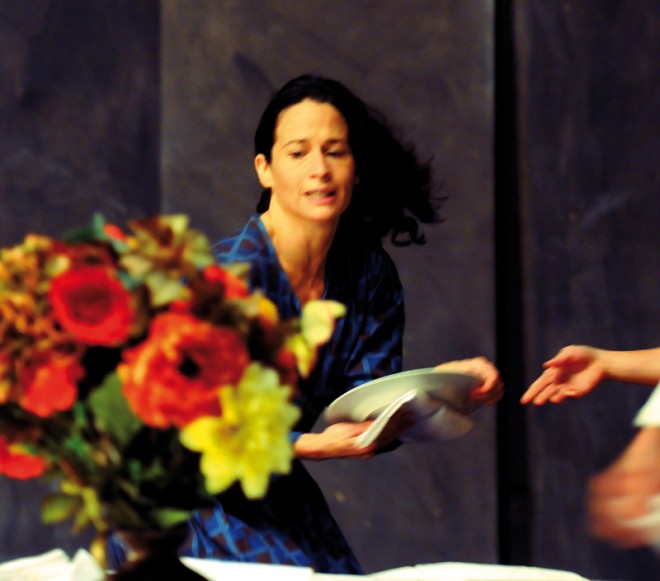 Un chaos, dans lequel les performers courent plus qu’ils ne dansent -nombreux sont ceux qui en feront le reproche à la sortie- un chaos qui se termine par une bataille à coup de vaisselle et de peinture autour d’une immense table de banquet sous le contrôle d’un Christ suspendu à un hélicoptère télécommandé (clin-d’œil à une célèbre séquence de La Dolce Vita). Un final absurde, burlesque, malheureusement quasi ridicule -nous aussi, nous avons un reproche-.