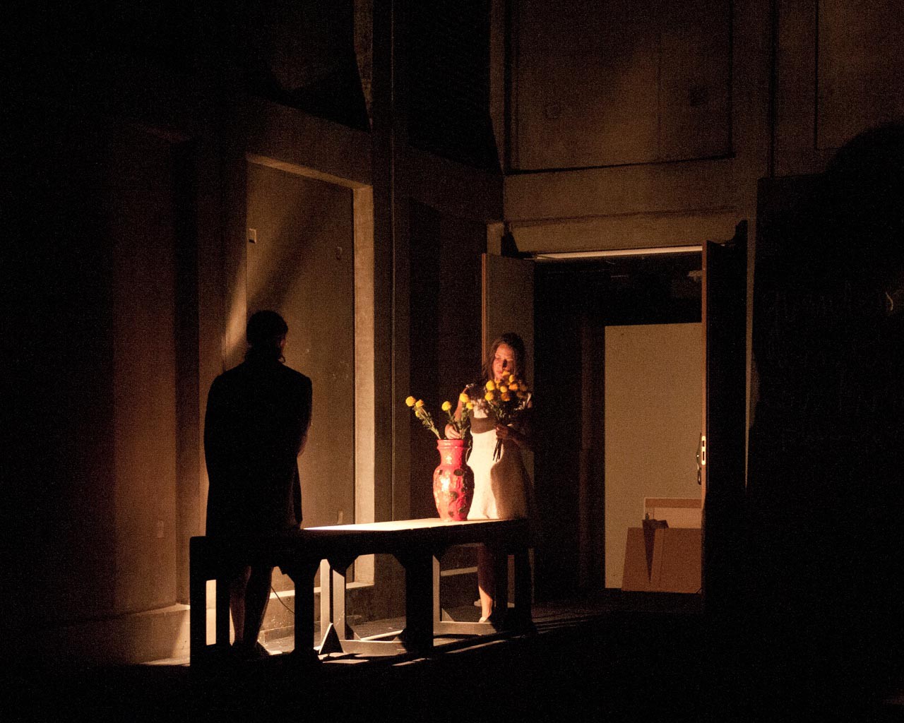 Et il fait noir, pour de vrai. Les quelques projecteurs s’allument et s’éteignent à répétition, il y a des flashs, des éclairs, et c’est cette faible lumière qui guide le spectateur. Les 7 protagonistes sont -probablement- des survivants. Ils bougent en petits groupes hétérogènes, effrayés et confus, perturbés par quelque chose.