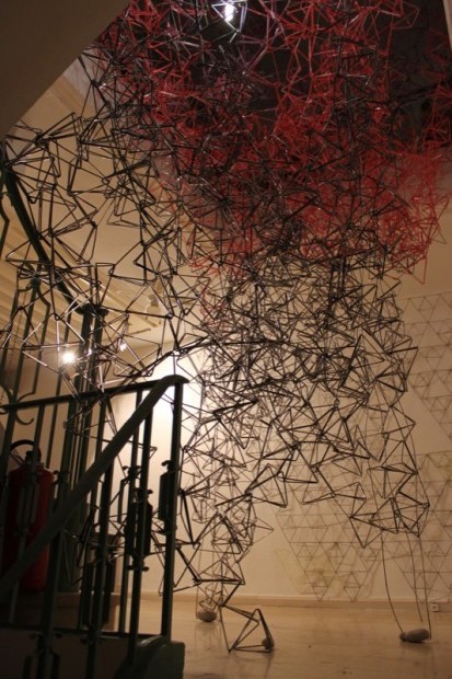 Les théoriciens de l’optique n’ont toujours pas résolu la chronobiologie de la connexion entre le cerveau qui s’abreuve de relevés et l’oeil qui collecte, si tant il s’avère que les récepteurs se conforment l’un l’autre. La vision stéréoscopique crée la sensation de profondeur, ainsi Matthieu Herreman, plasticien de trente printemps, reprend dans sa torsade formée de pailles coudées l’axiome de Vinci : « la pyramide visuelle a son origine dans un seul point et sa base dans le premier corps, ce qui fait que le second, d’égale grandeur, n’est pas vu. » De formats équivalents, chaque triangle de paille brasse de l’air ; reliés par les angles, ils forment une chaîne ADN extrêmement aérienne.