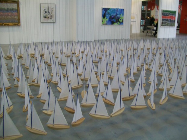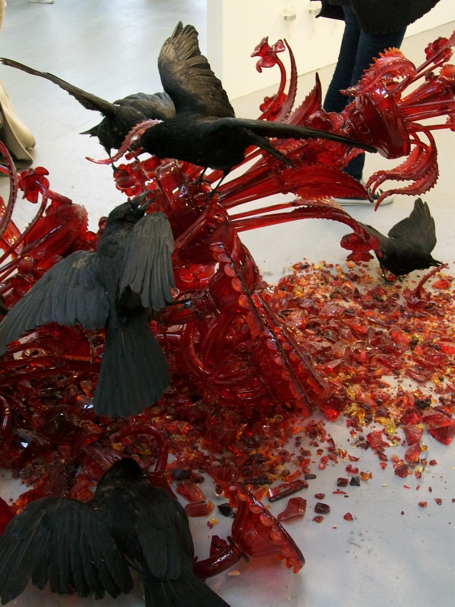 A l’entrée se trouvent les œuvres les plus imposantes. Si le délassant flottement des voiliers volants de Hashimoto constituait une halte irrésistible pour les visiteurs, un grand lustre de verre écrasé au sol et proie de sinistres corbeaux empaillés, oeuvre de Javier Perez, préfigure le contenu de l’exposition. Si la crise a menacé le succès de la foire, elle en est devenue dans le même temps le protagoniste réel. Émeutes populaires, lettres adressées à l’avenir, mosaïques des antidépresseurs, une précarité imprimée dans chaque œuvre, ont donné la parole à une récession non seulement financière mais aussi sociale et existentielle ; un esprit de «party ending de l’Occident», comme le dessinateur et sculpteur Massimo Giacon a défini son gâteau hyper-pop de seins, sa colonne caoutchouteuse des prothèses dont la sympathie cède rapidement la place à la référence cruelle à une accumulation de tissu cicatriciel et à l’avortement.