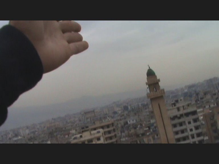 D’abord, il y a la distance qui s’instaure de Salim à moi, qu’impose la caméra de Salim. Je lui dis que je suis loin, il me dit que c’est mieux comme cela. Alors me voilà presque au centre du toit, debout, et je réponds à l’interview- face à Salim et à Hisham.