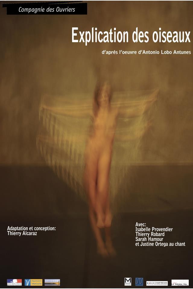 « Explication des oiseaux » d’après António Lobo Antunes / Mise en scène Thierry Alcaraz / Compagnie des Ouvriers / création Vidéo : Marie Jumelin / création Lumières Damien Gandolfo / Avec Isabelle Provendier / sera créé les 21/22/23/24 mars 2012 à la Chapelle des Pénitents Blancs à Avignon, puis repris en juillet 2012 au Festival Off d’Avignon. Rens. : theatre.ouvrier@wanadoo.fr