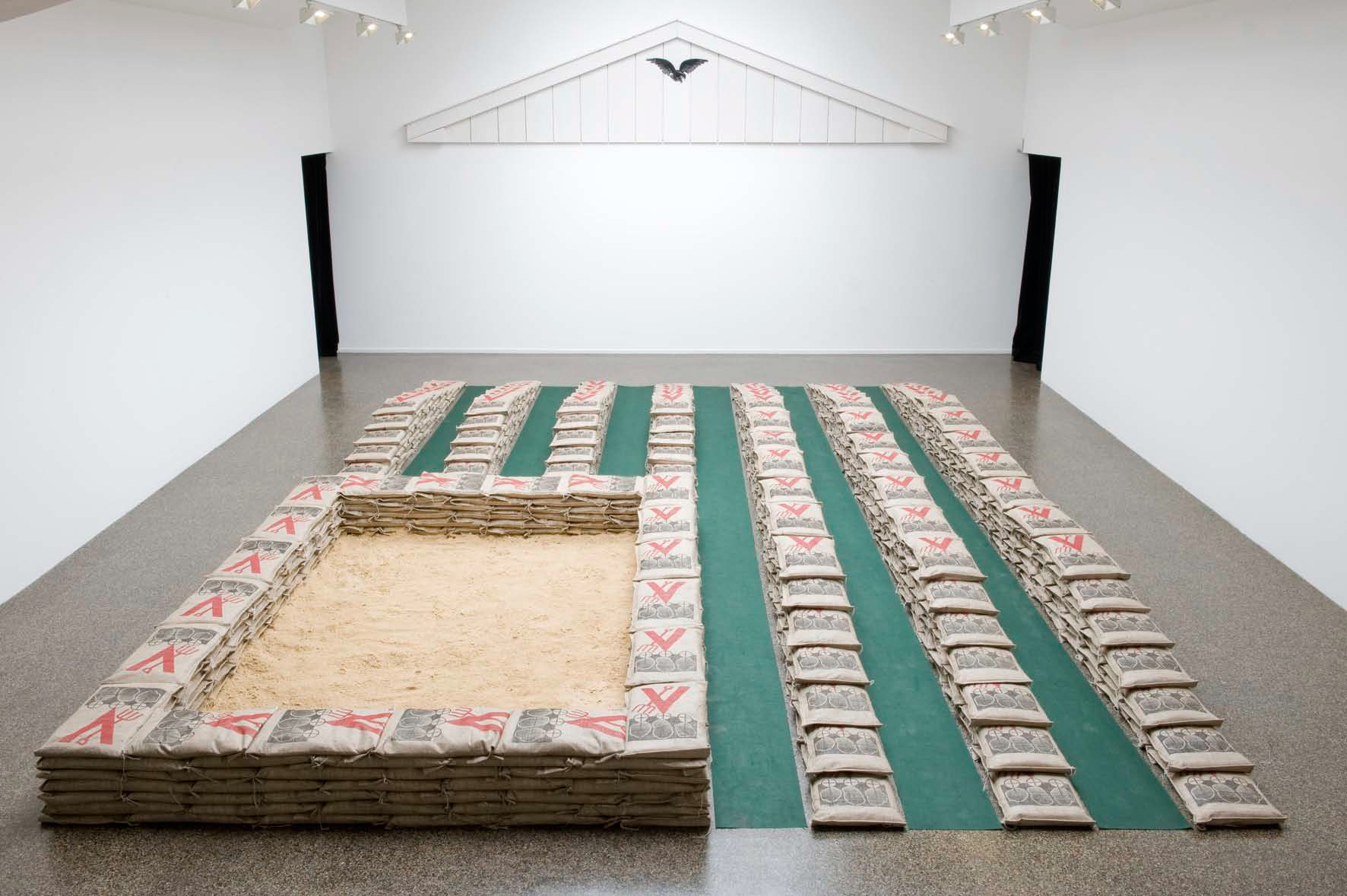 L’exposition se déploie dans deux salles. Au rez-de-chaussée sont présentées deux œuvres. Une œuvre au mur, Colonial Roof, qui est une reconstitution du fronton d’un bar en Pennsylvanie (Joe’s Bar). L’artiste a conservé le fronton triangulaire en latte de bois pentes en blanc, caractéristique de l’architecture néocoloniale, et au centre un aigle noir aux ailes déployées. L’aigle est menaçant, il semble se jeter sur sa proie. Il est un symbole puissant aux Etats-Unis, il incarne l’union, la force et le pouvoir. Au sol est présentée une installation intitulée Victory Garden (2011) qui est formée de 463 sacs de jute remplis de sable. Ils sont empilés et forment cinq rangées et un rectangle fermé. Ce rectangle ressemble à un inquiétant bac à sable pour enfant. Le tout est disposé sur une pelouse artificielle. Pourtant, il ne s’agit en rien d’un terrain de jeu. S’il n’est pas repérable au premier coup d’œil, il nous suffit de tourner autour de cet étrange jardin pour nous rendre compte que l’ensemble est une reformulation du drapeau américain.