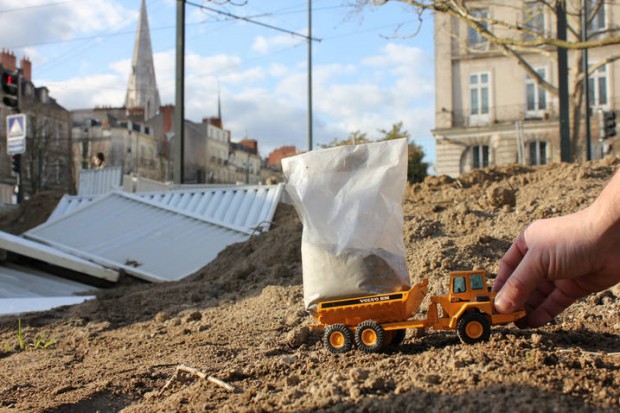 1. 340 grammes déplacés… during Levitated Mass by Michael Heizer 6e jour du déplacement – Côte Ouest, France, Nantes, février/mars 2012 Poussière de la voûte de la Cathédrale de Chartres. Courtesy Galerie Didier Gourvennec-Ogor