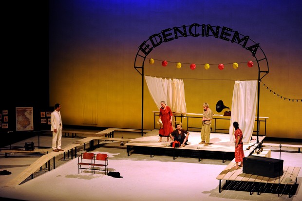Quant à la scénographie, elle est ludique et se prête aux variations du récit. Contrairement aux costumes, elle ne s’inscrit pas dans une perspective réaliste, jouant avec la lumière pour créer différentes atmosphères et indiquer divers moments de la journée. Surmontée de lettres lumineuses qui écrivent « Eden Cinéma », la scène joue sur deux niveaux entre le sol en sable et les pontons en bois.
