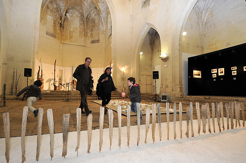 Aux quatre installations et à la volière magique de Laval, correspondent des photos sur papier salé de Bruno Privat …. Les épreuves de sténopé évoquent l’immuable temporalité du delta du Rhône, l’impression une fois fixée en sépia foncé renforce le poids du temps, la lenteur de la vie entre eau et terre. L’harmonieuse mélancolie de l’horizontalité encadre les installations de J-R Laval qui occupent en bas des marches sur les dalles toute la nef de la chapelle. Dès l’entrée, dans un enclos, un cimetière taurin, un corral où sont échouées des têtes de bêtes, des crânes, des cornes, un tableau de chasse épizootique, un seul crâne peint en noir rappelle la noblesse des bovidés semi-sauvages dans les marais et dans l’arène. Pièce surchargée où l’accumulation des signes fait penser à un attirail surréaliste, un dépositoire d’oublis. La deuxième pièce est constituée d’une large bande de sable des marins salins où une dizaine de poteaux de clôture nous mène radicalement à l’opposé de l’encombrement.