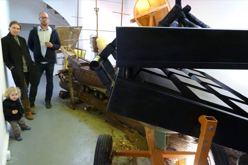 Où l’on rencontre l’ « in/appartenance », une forme originelle de liberté, l’absence de terre et l’humain pour ancrage. L’exil et le partage sont les thèmes fédérateurs du récit de l’œuvre (la main, la cabane, le bateau, l’âme pirate, la lampe, le chaudron, le gaufrier, le camion, etc). Où l’on a le sentiment que toute l’œuvre déploie en sourdine, par leur absence, les symboles de la matérialité, de la propriété. Ces symboles ici désacralisés, sont joliment détournés en autres projets que l’option de leur fonction première. L’apparent désordre jubilatoire oublie, sans jugement, la vanité aléatoire d’un monde consumériste et ses contraintes déterministes, qui se consume, se cannibalise.