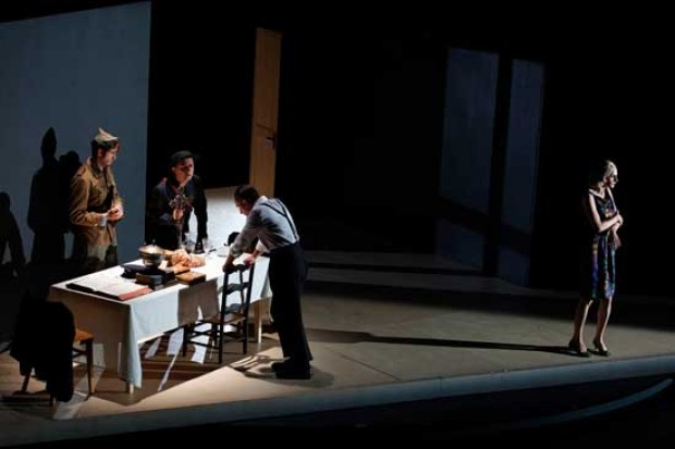 La scénographie se compose d’un immense plateau tournant qui montre plusieurs faces d’une maison. La spécificité du texte est qu’il raconte trois fois la même histoire vue sous l’angle différent des personnages d’une même famille. Pendant que le père est dans la salle à manger, la femme est dans la cuisine et la fille dans sa chambre. Chacun vit sa petite histoire (à laquelle se mêlera la grande histoire de la guerre d’Espagne) de façon différente.