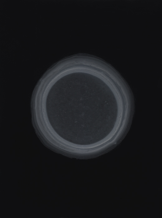 Ismaïl Bahri va réitérer l’expérience liant bulle, lait et hasard en formulant la série photographique intitulée Latence. Sur une plaque en verre, il dessine un cercle de lait au pinceau. Au contact de l’air et au fil des heures, le lait se caille, il produit une infime pellicule avec laquelle l’artiste va travaille. Il procède à des mouvements de rotation de la plaque, créant ainsi des strates à l’intérieur du cercle. Le résultat est proche d’une radiographie d’un minéral, d’un os, ou bien d’une vue microscopique d’une cellule organique dont les stries « sont des marqueurs lents du temps. Le dessin procède par sédimentations : plus il met du temps à être travaillé et plus les stries s’accumulent. » Sur le processus, Ismaïl Bahri explique : « Dessiner ici relève de l’attente, d’une forme de désistement maîtrisé. Je dessine en m’insérant dans des plis, en inscrivant des lignes dans le sillage des ellipses qu’imprime le liquide. Après avoir tracé le cercle au pinceau, le dessin, progressivement, est mis dans l’orbite de cette première impulsion. C’est une sorte de dessin par gravitation. ».(2) Le banal est transcendé via un dispositif constitué de gestes simples. L’artiste est à l’écoute de la matière et de son propre geste. Il ne tend pas à maîtriser les effets et les évolutions, bien au contraire il se laisse guider par les formes qui se construisent au fil des heures.