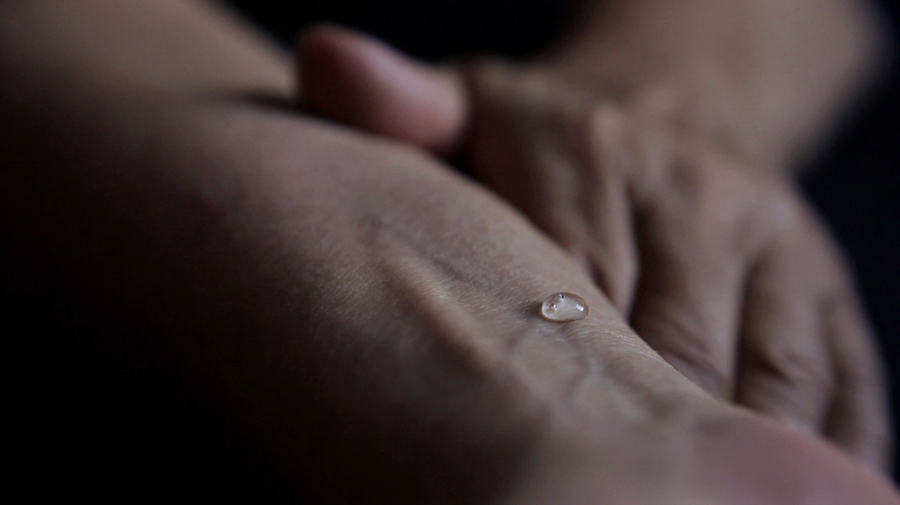 Peu à peu, le lien entre environnement, corporalité et regard s’établit et se traduit par une œuvre comme Ligne (2011) où une goutte d’eau fait corps avec la peau d’un individu, faisant ainsi « office d’intermédiaire sensible aux moindres intensités qui traversent le corps. Elle demeure en surface, mais sonde, par capillarité, une intériorité enfouie. » Le film Attraction (2011) nous plonge dans l’obscurité où apparaît et disparaît une main qui attirée par une faible source lumineuse, tente d’accrocher, de toucher ou de capter la luminosité évanescente. Un travail épidermique et sensible qui résonne avec une série photographique intitulée Sang d’Encre (2009), où un coude, un œil et des mains sont partiellement recouverts de points d’encre brune. Comme la goutte d’eau, le lait ou le gobelet plein, la matière est employée comme un vecteur à la fois visuel et sensoriel. Elle est l’écran et le moteur de l’action ou de l’inaction. Ici, les points d’encre soulignent et marquent le passage du temps sur la peau. Ismail Bahri réinvente l’écriture en lui donnant de nouvelles propriétés, métaphoriques et poétiques.