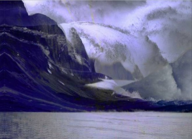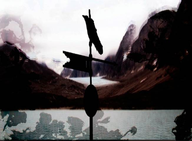 Ce petit joyau, ciselé tel un livre d’heures du Moyen Age ou un carnet de voyage du Grand Nord représente un fjord datant de milliers d’années, des tonnes de glace et de pierres formant une crevasse des traces premières traversée de droite et de gauche par le vol des corbeaux dont on ne sait toujours pas où et pourquoi ils se cachent pour mourir, le vol des esprits bons ou mauvais qu’incarne cet animal sacré rappelle à chacun la danse des ancêtres ; cruauté et crainte se joignent, le vide extrêmement habité nous entoure.