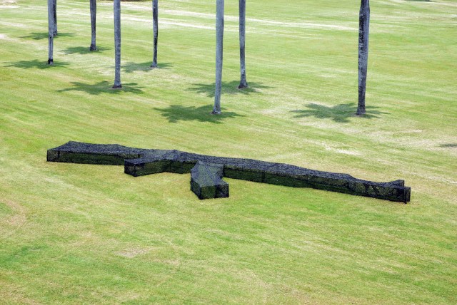 Puis Philippe Perrin a recouvert cette structure d’un filet de camouflage militaire noir géant, qui, comme un linceul, vient planer sur la pelouse de l’ancien green, forme fantomatique connue de tous et dans le monde entier, celle d’une AK 47. Ombre de la révolution, fantôme noir de ses espérances…