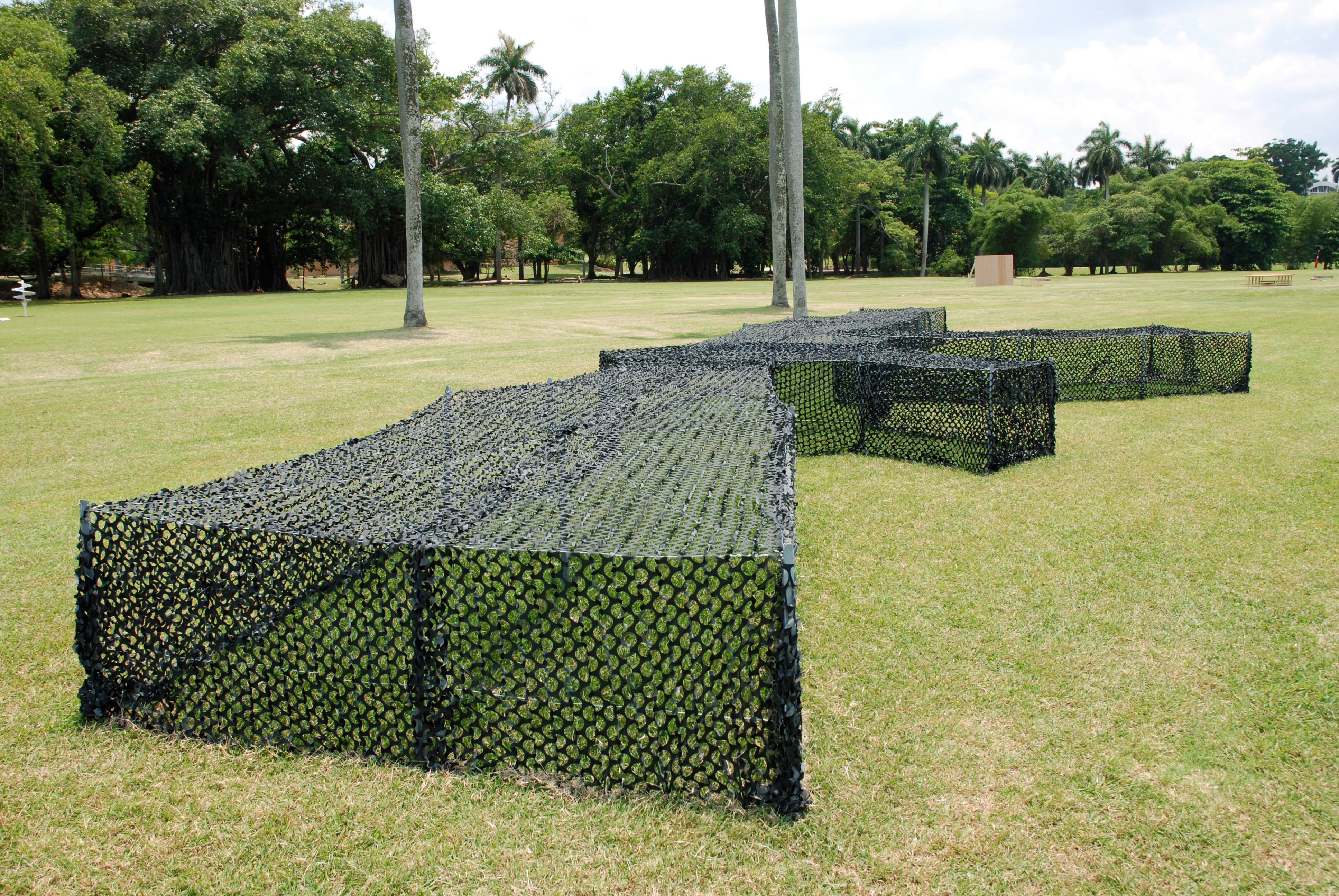 L’artiste a délimité une zone précise sur la pelouse de l’ISA, anciennement parcours de golf de Fulgencio Batista, tracée par des tiges d’acier plantées à la verticale dans le sol et solidarisée par des filins d’acier dans son pourtour. Tel un « no man’s land », un camp de réfugiés, un enclos à bestiaux ou une propriété privée cernée de grilles, ces lieux n’ont pas la même fonction mais ont le même principe de réalisation et le même but, l’isolement. Cette « zone/enclos » est le squelette de l’oeuvre.