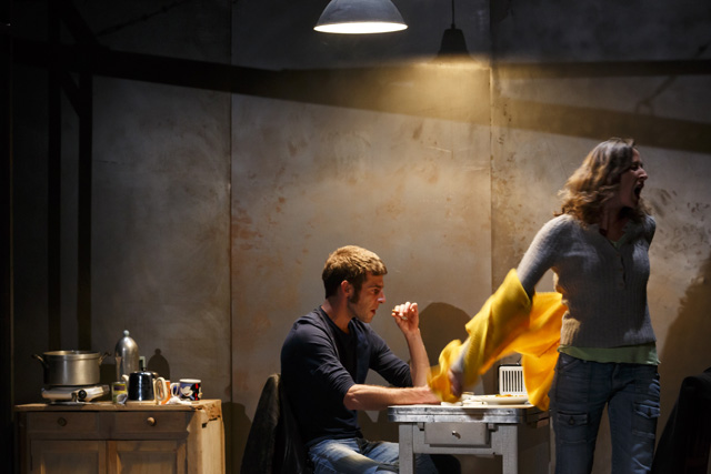 Comme à son habitude, le metteur en scène construit une dramaturgie caractéristique de son travail, entremêlant récits et personnages, alternant scènes âpres et rock et tableaux visuels. Le travail de la bande-son est essentiel, tout comme la scéno -ici un dispositif multi-usage qui occupe toute la moitié du plateau- la vidéo et la création lumière, dans laquelle bien sûr on reconnaît inévitablement la « patte » Matignon.