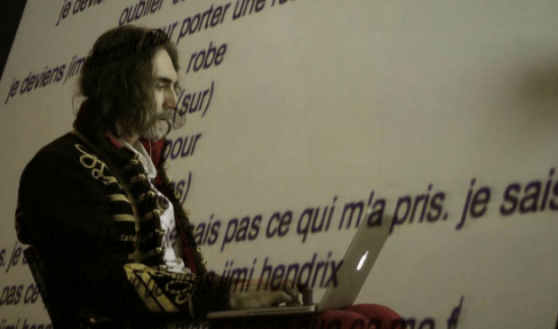 Sur scène, le futur JiHache en devenir constant et deux écrans vidéo sur lesquels défilent des monologues historico-musicaux et, d’un autre côté , des textes tapés directement par Eric da Silva. Entre la scène et les deux écrans la lecture n’est pas aisée, mais il faut s’accommoder du ping-pong incessant, aller à droite et à gauche, et butiner une phrase, un mot, souvent très drôle.