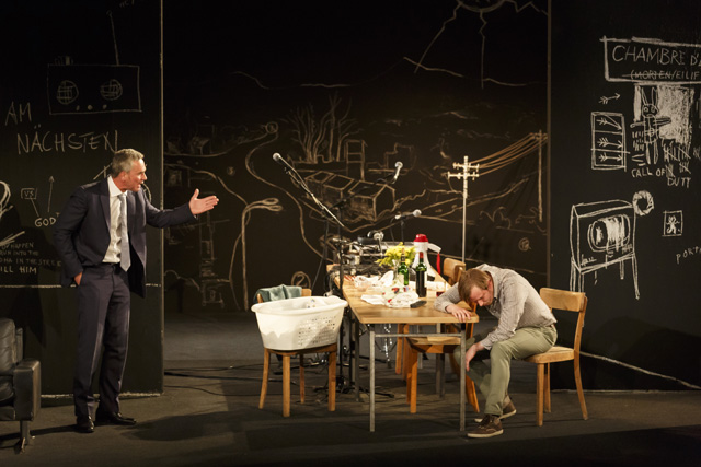 C’est donc bien du Ibsen, mais revisité avec la rage nécessaire d’Ostermeier et son engagement sans faille. Et cette oeuvre particulière qui correspond à un moment charnière dans la vie du dramaturge, écrite en 1881 alors qu’Ibsen s’est volontairement exilé de Norvège après l’échec de sa pièce précédente « Les Revenants », prend alors toute sa dimension métaphorique. Un Ennemi du Peuple – « Ein Volksfeind »- est chez Ibsen déjà une oeuvre radicale, violemment anti-système et profondément pessimiste. Ostermeier s’en empare avec toute la maestria dont il est coutûmier, mettant au service de sa dramaturgie l’expertise maline du théâtre qui le caractérise. Sa mise en scène est puissante, carrée et pleine de ces idées que l’on admire chez les plus grands. Sa troupe -extraordinaire de professionnalisme- du Schaubühne sert cet « Ennemi » de la plus belle des manières, avec une rage et un charisme évident. Stefan Stern en Stockmann idéaliste mais combatif est exceptionnel, de même qu’Ingo Hülsmann en conseiller municipal incarne ce personnage d’une férocité et d’un cynisme absolu avec une superbe rare. Bref, les acteurs sont admirables, la scénographie intelligente et plutôt réussie et le génie théâtral d’Ostermeier bien vivant.