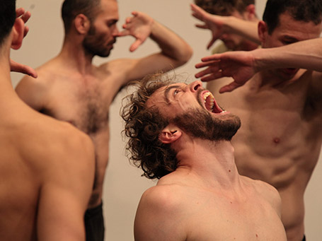 Ces deux figures, Olivier Dubois s’en est servies comme fil conducteur, il les a distinguées en leur attribuant chacune un temps propre. Tout d’abord, l’on assiste à la démarche apollinienne des corps nus. Des plastiques qui ne se regardent pas, ne se touchent pas. Au plateau il n’y a alors que des individus, des subjectivés. Les regards sont au loin, perdus à l’intérieur d’une conscience malheureuse, repliée sur elle-même.