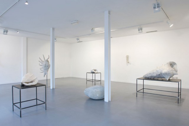 Les œuvres sont réparties en deux salles distinctes. Au rez-de-chaussée, nous sommes accueillis par des coquillages surdimensionnés disposés sur des socles métalliques aux formes épurées ou bien enfourchés sur des tiges. Nous sommes ainsi invités à circuler dans l’espace et à tourner autour de ces étranges coquilles, qui peuvent également nous amener à penser à des ossements. L’une d’entre elles contient une coquille de noix sculptée dans le bois. D’une coquille à une autre, Laurent Le Deunff instaure un mystère. Ses pièces sont des curiosités partagées entre naturalisme et surréalisme. Un naturalisme galvaudé puisque toutes les pièces sont conçues à partir de matériaux de récupération : papier mâché, grillage à poule et ciment. Notre perception des objets est brouillée : dimensions, poids, matériaux, une nouvelle relation est proposée. Le familier et l’énigmatique dialoguent.