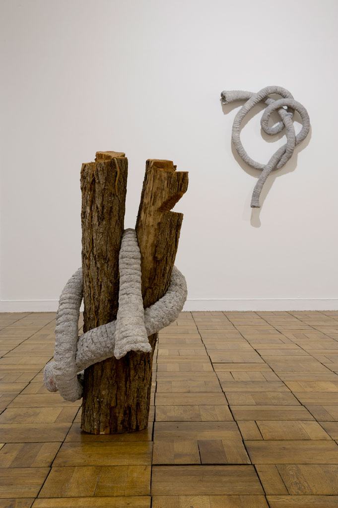 À l’étage, les trompes se démultiplient, s’allongent et s’entremêlent. La série Nœud de Trompe dialogue avec l’espace, aux murs et au sol. Les trompes grises enserrent des coussins en velours, une vieille planche ; elles s’enroulent autour d’une souche d’arbre. L’une d’entre elles, disposée au sol, prend la forme d’un nœud marin, comme un écho aux coquilles vides. La trompe se fait serpentine. À propos des matériaux il précise : « C’est généralement le matériau qui m’inspire, me donne envie d’envisager d’y faire une forme, souvent figurative et je mise sur le décalage vis-à-vis du sujet pour évoquer de multiples lectures. Je n’ai pas d’atelier fixe et dans la mesure du possible, je réalise mes pièces dans l’endroit où je suis invité, le contexte et les rencontres sont déterminants. Je n’aime pas dessiner ou réaliser des croquis préparatoires, par contre, je me sers de temps en temps de formes préexistantes mais le plus souvent je les abandonne lors de la réalisation pour essayer de profiter des particularités, des qualités, de la résistance et des défauts de chacun des matériaux que j’utilise. »[1]