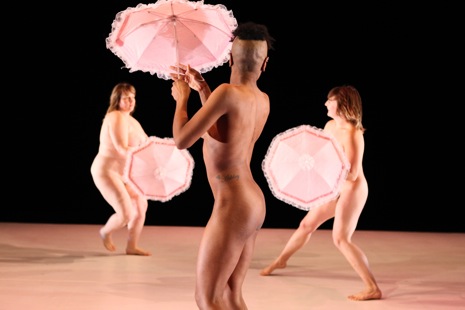 La sexualité comme centre de gravité déplacé du coté de l’apparence, place l’observateur dans une position idéale, là il peut remettre en question chaque cliché incarné par ces actrices à la rage authentique. Avec cette suite de chorégraphies stylisées, édulcorées, accessoirisées par moment avec des ombrelles, le spectateur reconnait immédiatement les phénomènes propres à l’abondance actuelle des images de type érotico-pornographique qui fleurissent un peu partout. Ces images substituant les fantasmes de l’observateur au profit de tel ou tel produit. Young Jean Lee déroule avec ces figures un enchaînement de stéréotypes culturels et publicitaires de l’érotisation bon marché, de préférence sadomasochiste.