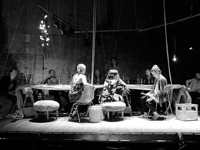 Au plafond dans la salle et sur scène, des veilleuses, cette petite lampe qui reste allumée dans le théâtre quand tout le monde part : la pièce de Gorki est comme une veilleuse, où les bourgeois, juste avant la révolution, sont encore là, au soir de leur vie (même les plus jeunes) et attendent péniblement que tout le monde parte. Les méthodes profondément brechtiennes, cet « aveu de théâtre » comme le dit si justement Bernard Dort du TG STAN, est là pour donner à cette pièce crépusculaire un dynamisme, un éveil qui rend le spectacle extrêmement dynamique et presque joyeux. On rit beaucoup et l’on ne perd rien de l’histoire, même si chaque acteur, hormis Jolente De Keersmaeker qui prend en charge le rôle principal, interprète au moins deux rôles.