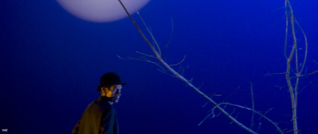 Le lieu du théâtre est par essence celui du discours performatif : l’énoncé des protagonistes a valeur d’action ; sur une scène, dire c’est faire. On comprend mieux alors, au travers des dires de Vladimir et d’Estragon – ces deux représentants d’une humanité laissée pour compte – que les deux vagabonds d’En attendant Godot fassent du surplace … La vacuité de leurs échanges renvoie à leur incapacité à s’éloigner de ce lieu lunaire, planté d’un seul arbre, autour duquel se dévide en boucle leur manque d’existence.