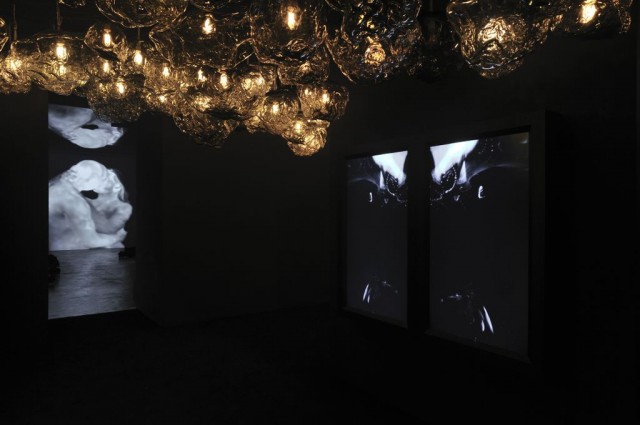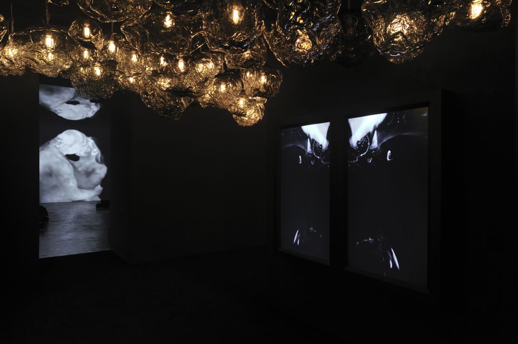 La première salle présente une installation lumineuse composée de 200 pièces uniques de verre réalisée à partir de sabliers d’occasions achetés par l’artiste sur e-bay. L’œuvre dialogue avec le matériau qui la compose. Le temps écoulé, qui en est à l’origine, est à jamais figé dans le verre et est devenu une œuvre à la fois poétique et inquiétante tant cette espèce de nébuleuse dont l’intensité lumineuse dépend de la vidéo d’une chauve-souris volant au ralenti, pose question.