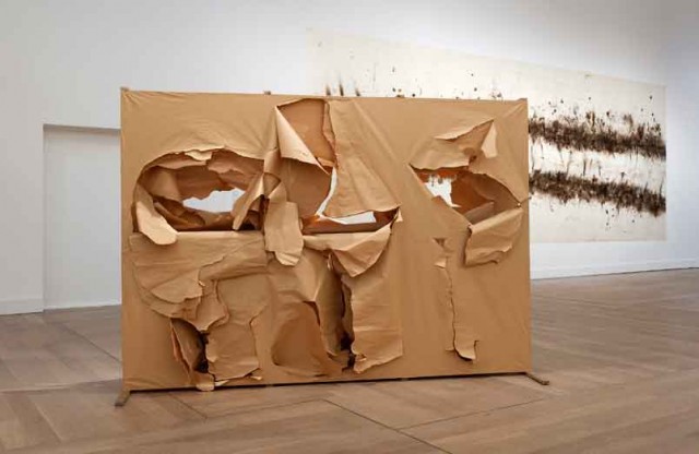 Visuels : 1/ Saburo Murakami, Muttsu no ana (Six Holes), 1955/2006. Installation view from Explosion! Painting as action, 2012, © Photo: Albin Dahlström / Moderna Museet 2/ Jackson Pollock, Painting (Silver over Black, White, Yellow and Red), 1948 © héritiers Jackson Pollock 2012. 3/ Jackson Pollock dans son atelier © héritiers Jackson Pollock 2012.