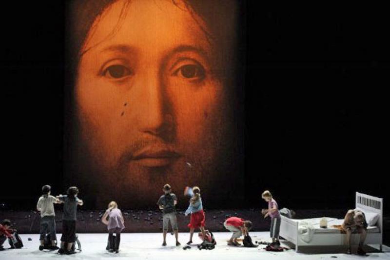 Dans la pièce de Roméo Castelucci, un vieil homme est victime d’incontinences incontrôlées, il répand sur son lit et sur le sol des litres d’excréments. A ses côtés, son fils prend soin de lui, mais finit par s’épuiser et à s’en remettre à une immense figure du Christ, qui domine la scène, en se plaquant contre ses lèvres. A cet instant, un liquide sombre dégouline sur l’image du Christ, qui se gondole et se déchire.