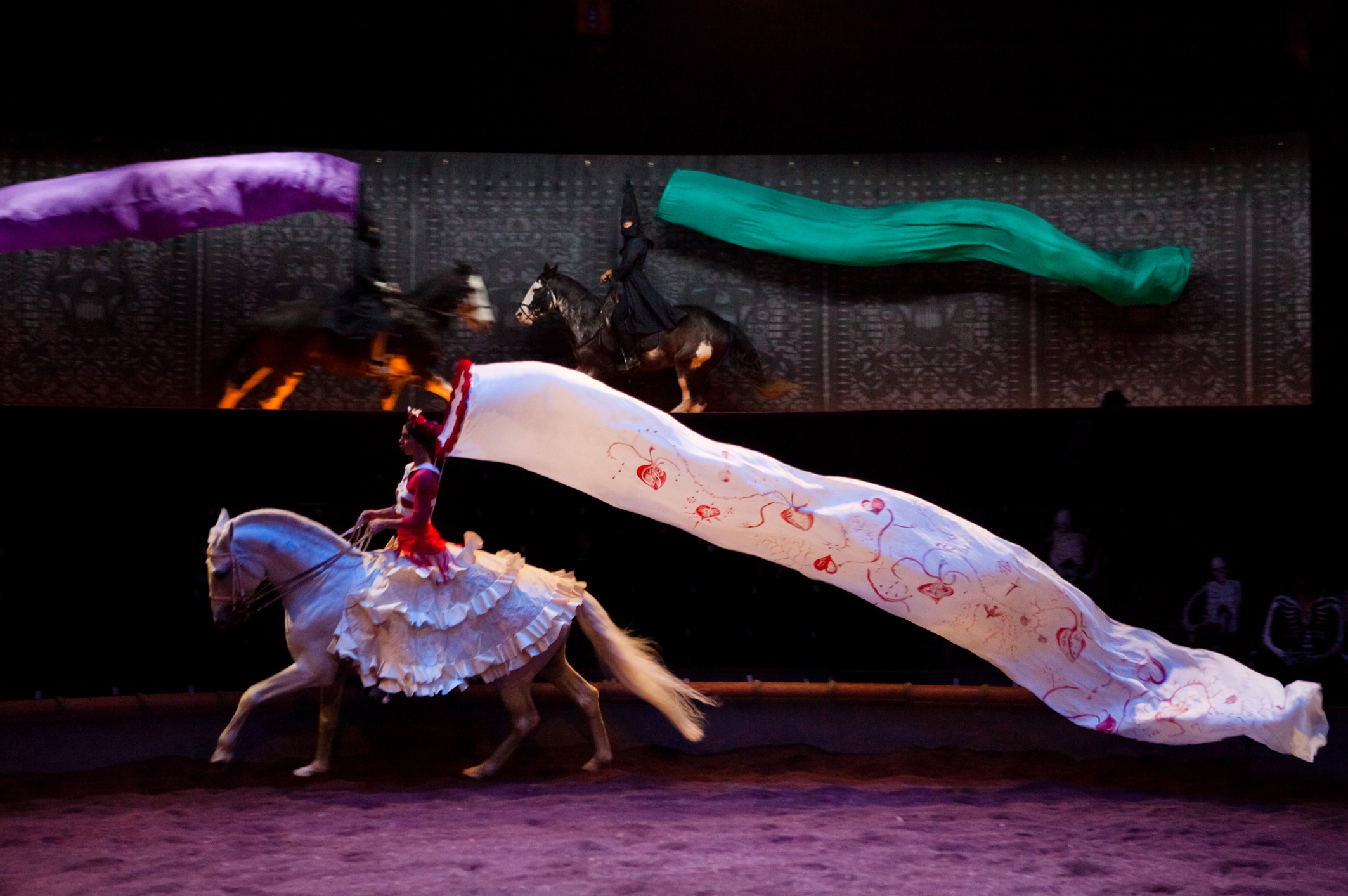 Bartabas nous prend par la main et emmène peu à peu l’ensemble du public dans son imaginaire peuplé de squelettes, passant de la « Calavera Garbancera » au bandit révolutionnaire Zapatiesque tirant sur tout ce qui bouge. Hilarant. L’utilisation de filins permet aux cavaliers-acteurs de voler dans les airs, soit telle une petite fée légère et gracieuse, soit tel un aigle fonçant sur le public, se jouant de la gravité et comme flottant sur les flancs de chevaux d’une rare beauté. Les chevaux dans ce spectacle jouent eux pour une fois le rôle de passeurs entre les mondes, seuls êtres incarnés des différents tableaux. Incarnation de la chair et de la vie.