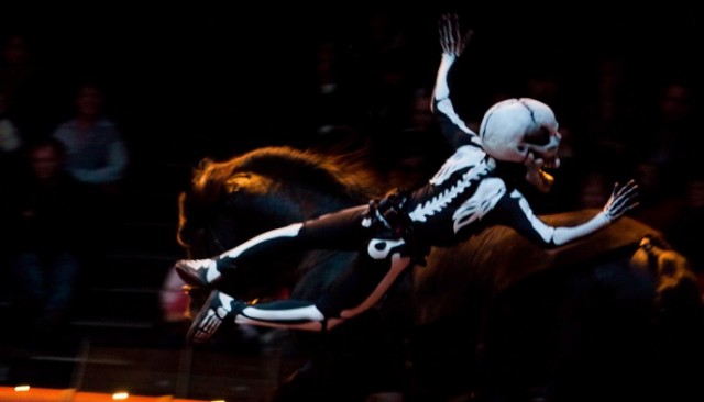 Tout commence dans l’obscurité et le silence. Puis des sons étranges et puissants, évocateurs du mystère et de la dramaturgie de la mort annoncent le spectacle qui débute par un carrousel de chevaux tournoyant sur la partie haute de la scène, dans le dos des spectateurs. Les tableaux s’enchaînent, tantôt féériques, tantôt drôles et morbides, aussi bien au centre du cirque qu’au dessus des gradins. Les décors, masques et costumes, très réussis, sont tous issus de l’imagerie propre à la « Fête des morts » mexicaine oscillant entre la mort, l’enfance et le jouet, tels des squelettes découpés dans le papier. Bartabas s’offre même la liberté de nous livrer le Baron Samedi version calaveras comme Maître de cérémonie.