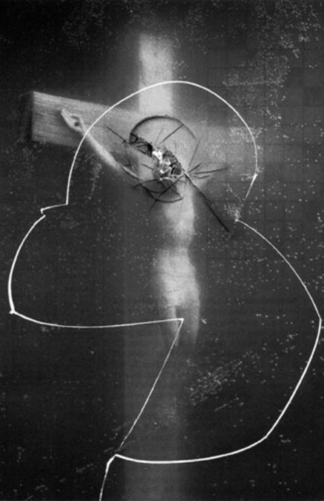 La pièce de Pascal Pinaud, une reproduction numérique d’une image de presse sur papier (2,70 x 1,80 m) sur toile, montre donc l’œuvre de Serrano donc la vitre de l’encadrement a été brisée par un visiteur. L’artiste a choisi de réunir et de reproduire ces images qui sont en fait des constats d’actions visant à saccager des œuvres (dans le cas de Serrano il s’agissait de raisons religieuses). L’image agrandie de l’œuvre profanée de Serrano a subi une nouvelle attaque puisqu’un passant a griffonné au stylo-bille noir : « Le Christ Roy » et « Le Christ Roi ». Un geste que Pascal Pinaud n’a pas souhaité faire disparaître puisqu’il souhaite que l’œuvre soit exposée en l’état. Le geste absurde instaure une mise en abyme du sujet même de la série.