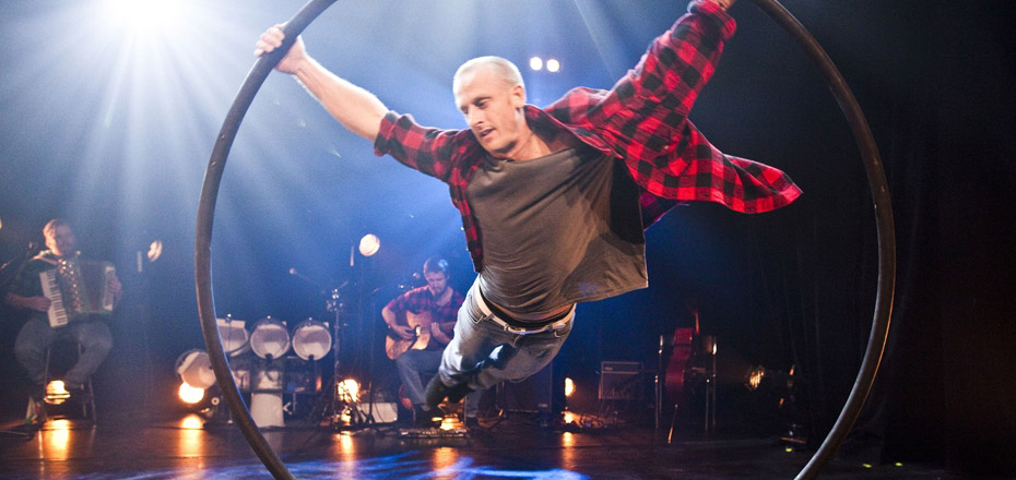 Il est toujours intéressant de voir comment l’on crée ailleurs et les dramaturgies nordiques sont, en Europe, très différentes de ce que l’on peut voir en France. Les cirques viennent souvent d’Amérique du Nord ou des pays du Sud de l’Europe. Ici, 3 acrobates aux airs de bûcherons donnent la réplique à un musicien aux allures de Thomas Fersen (grand, lunaire et jouant du Ukulélé). On nous met de suite dans l’ambiance, pas de paillettes, pas de jeunes gens séduisants et performatifs.