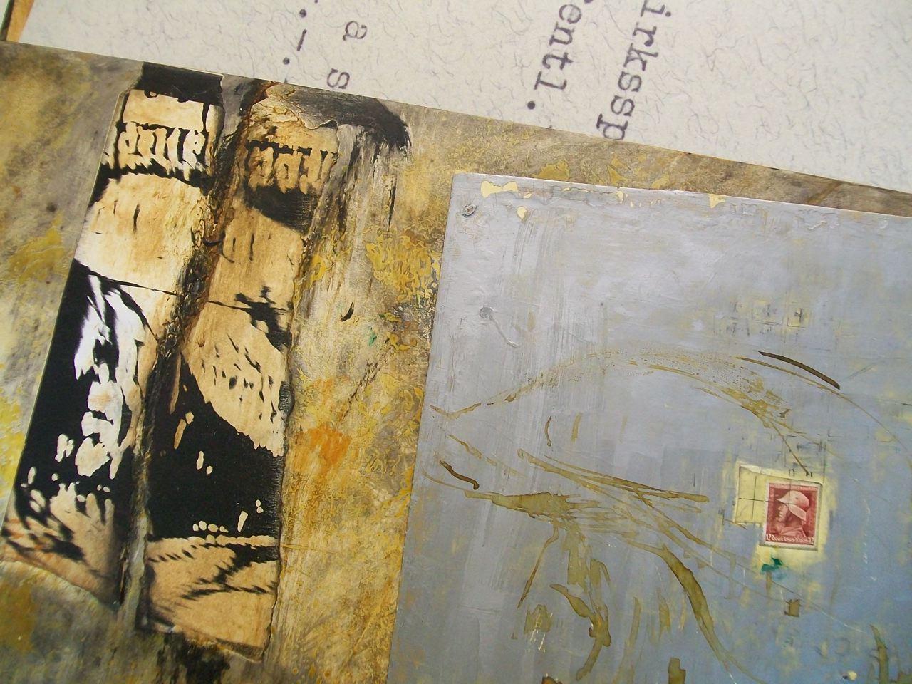 Nous revenons à cette idée de laisser une trace, chère à Leinman, pour qui la transmission est essentielle. Laisser sa pierre pour participer à la construction permanente du monde, devoir de mémoire et devoir de vie également, car la source de la vie est dans le renouvellement, qui s’effectue dans l’instant présent. Dans cette optique, Colette Leinman est aussi une grande « récupératrice ». En effet, elle « recycle » des matériaux pour ses oeuvres : notamment d’anciennes affiches, des photographies, des morceaux de bois, de fils de fer, mais aussi des articles datant de l’époque du IIIe Reich (timbres à l’effigie d’Hitler, cartes postales écrites par des officiers SS et envoyées aux membres de leur famille dans les années quarante…). « On peut faire voler plein de choses bizarres / un ballon / un cerf-volant / une montgolfière / un fer à repasser » (CQRDE, p. 52). Elle transforme ses trouvailles pour les intégrer à des peintures et des collages fascinants. Ce goût qu’elle a pour établir des liens entre « des choses qui n’ont apparemment rien à voir ensemble », dans un « besoin de rattacher, d’ajuster, pour ne pas être perdue », délivre le visible, pour reprendre la formule d’Yves Bonnefoy, et donne corps à ce qu’elle voit : « De l’espace boulimique / du trop plein / qui remue / au-dedans des choses (contre le vent) » (CQRDE, p. 18).
