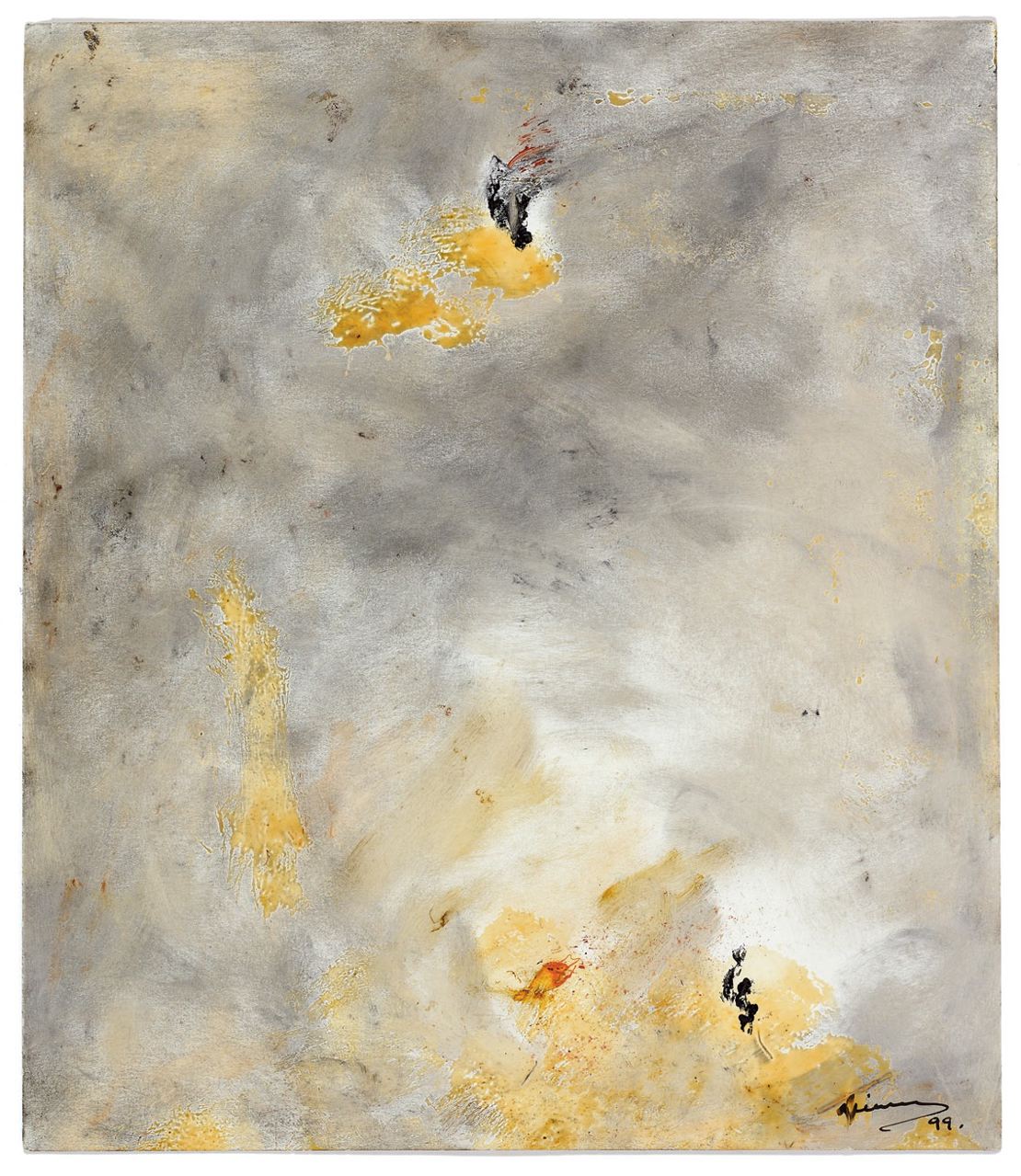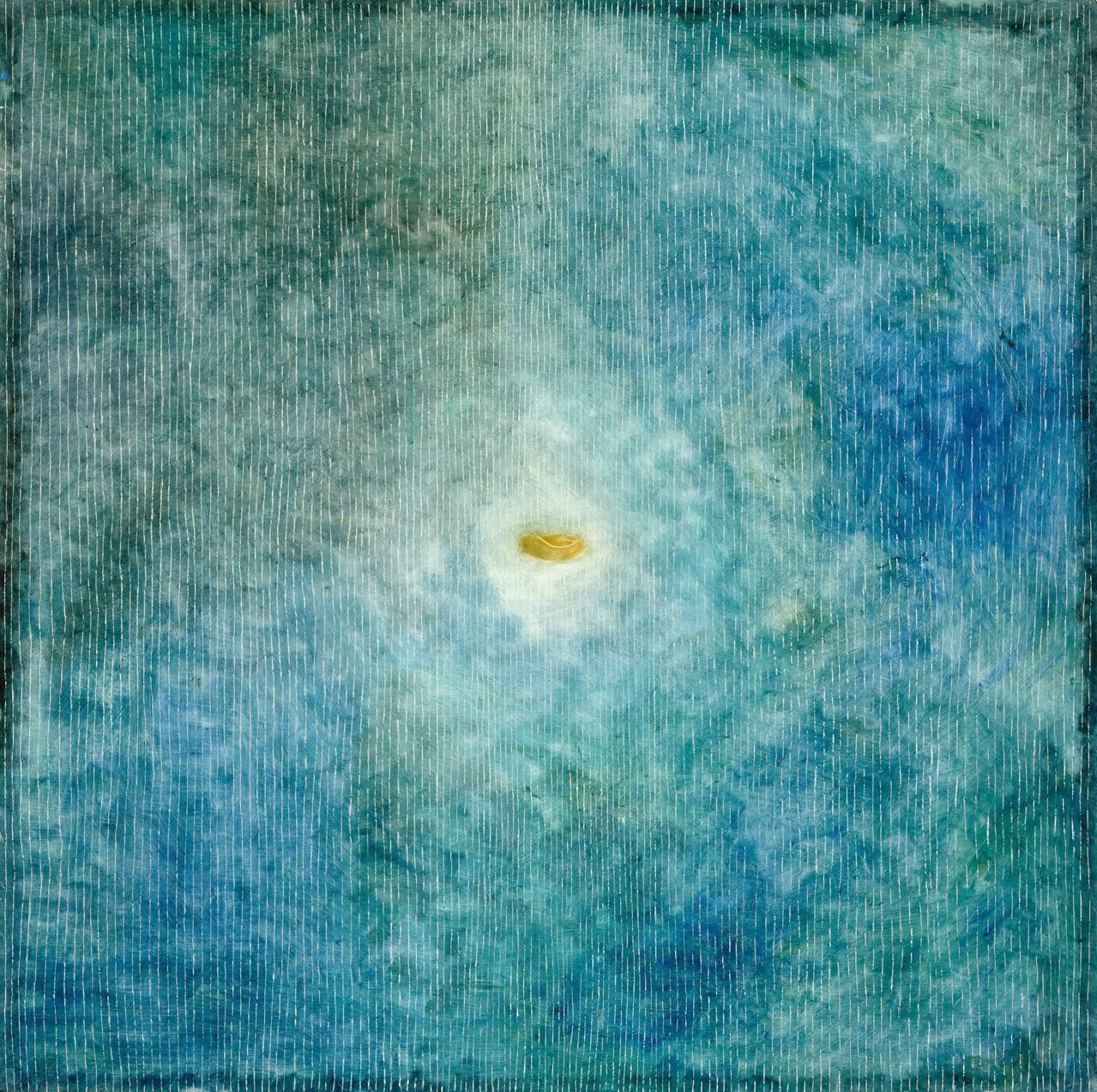 Dans les tableaux de la série des « abstraits », la tension est amenée par un fond d’apparence chaotique qui suggérerait l’infini, et la présence insistante des lignes, « les méridiens », qui se répètent de façon régulière, et contribuent à unifier l’ensemble. « Le sens du toucher où se déplacent les pluies / obliques / faites d’un trait, d’un autre et d’un autre… » (CQRDE, p. 31). Grâce au patient grattage et creusement dans la toile et les couches de peinture, cet infini porte en lui l’ordonné.