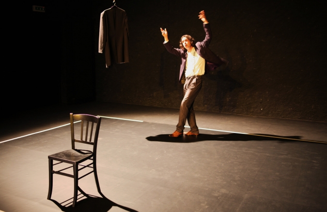 Ainsi, quand celui-ci entre sur le plateau avant le noir qui annonce le début du spectacle, surgissant comme un spectateur en retard, il s’adresse au public. Son monologue intérieur est ainsi extériorisé, énoncé en direction des spectateurs qu’il regarde en face.