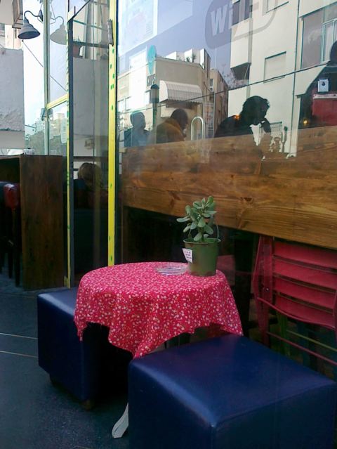 On s’asseoit et on expire longuement pour se débarrasser du poids ankylosant des contrariétés. La rêverie étouffée auparavant par le brouhaha de la ville peut reprendre son cours. Le tabouret bas nous force à lever la tête et à regarder les personnes autour de soi : elles réfléchissent, contemplent, et parfois leurs yeux pétillent de bavarder et de rire ensemble. On voit aussi des cyclistes slalomant entre les piétons, des chats toisant les passants du haut de leurs poubelles-tours-de-château, ou de murs évoquant une île grecque. Plus haut, des palmiers déploient leur magnificence sous le ciel clément, et des nuages chatouillent les nacelles des grues inlassables.