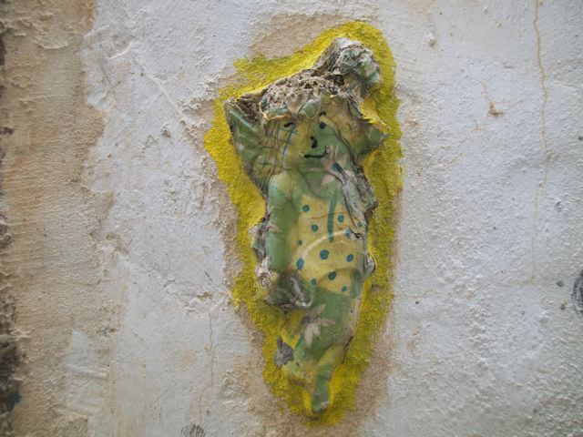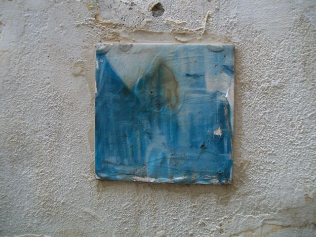 On frémit avec ce papillon battant de lourdes ailes dorées sous une frise de fleurs de myosotis, ou de pervenches, peu importe. Ce qui importe c’est ce bleu-là, qui réchauffe et caresse, offrant un bonheur instantané. Ce bleu et ses nuances baignent l’allée lépreuse et ses tableaux improbables. Il nous souffle une brise de mer au visage ; elle est là, derrière le mur.