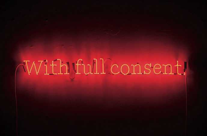 Citons également le très sucré Will Cotton qui montre une huile romantico-érotico-hamiltonienne où une jeune fille se pâme dans un nuage acidulé de barbe à papa, ou encore Jill Magid qui utilise le néon pour délivrer son message érotique : « avec le plein consentement »…
